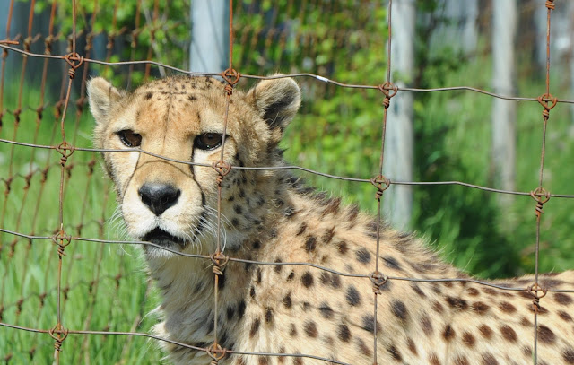 Not sure why this cheetah was behind bars. Mating season, grumpy, sick??
