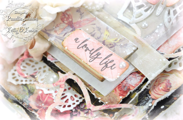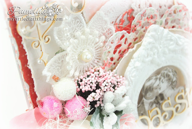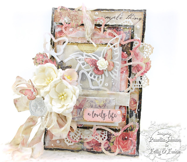 The doilies were cut with Spellbinders and Prima dies and the frame was a custom one that I filled with hot glue and painted with Gesso. Everything else is from Sandra's shop and can be found in the linky below.