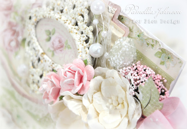 The leaves are Cheery Lynn, the doily is Prima, the sentiment die cut is Sizzix, the frame is hand made with a silicone mould, the flowers are Wild Orchid Crafts and everything else is from my stash.